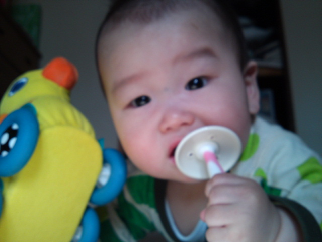 そんなみなとん、ついに上の歯まで生えてきたので、慣らし歯ブラシを開始しました☆