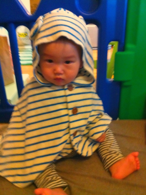あったかかったのに最近またちょっと肌寒いので、赤ちゃんホンポで1000円くらいだったポンチョ大活躍。