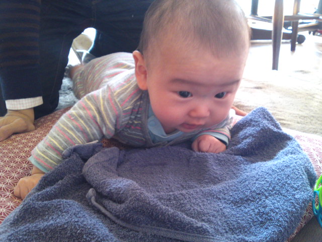 ミナトも無事3カ月を迎え、最近は腹ばいにするとアタマもこんな上げるようになり、