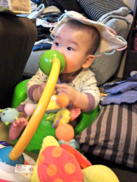 こんなふうにオモチャに夢中になって頭の上にタオル乗っけられてるのに気付きもしない姿も、